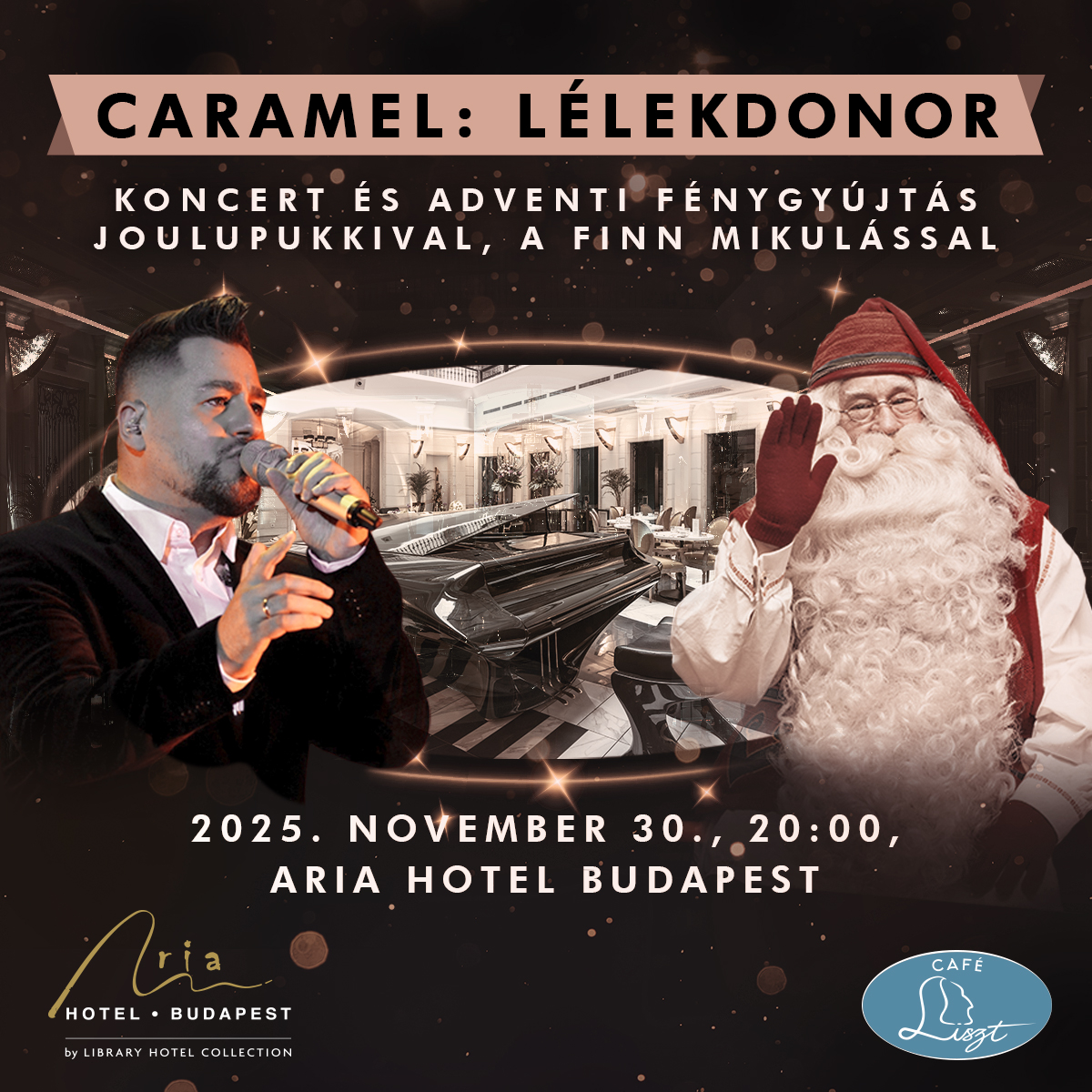 Már hagyomány, hogy az adventi időszak kezdetén egy kiváló muzsikus kapcsolja fel a karácsonyi fényeket az Aria Hotel Budapest műemlék épületében. 2023 óta a ceremóniához Joulupukki, a finn Mikulás is csatlakozik. Idén november 30-án Molnár Ferenc Caramel ad bensőséges hangulatú koncertet.